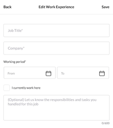 This section allows you to showcase your professional background. For each role, you can enter: