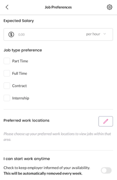 You can also set your preferred locations and your availability. If you're ready to start immediately, turn on “Can start work anytime.” This setting resets weekly, so remember to update it regularly.