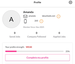 Building a complete profile helps you stand out and improves your chances of getting contacted by employers. After signing up, visit your Profile page—there, you’ll see a percentage that reflects how complete or strong your profile currently is. You can increase this score by filling in each section below.