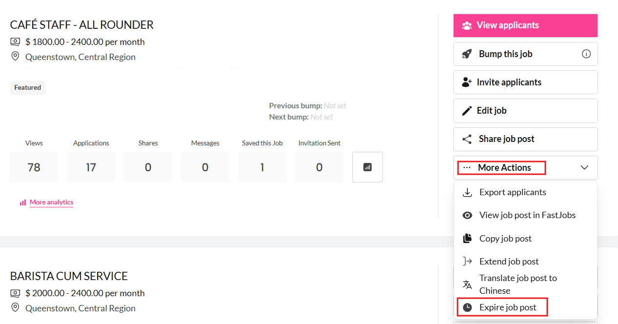 - On the right side of the selected posting, click on “More Actions” and choose “Expire Job Post.” Once done, your ad will no longer appear to jobseekers.