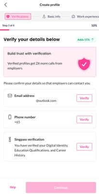 Get verified in three easy steps: link your email, mobile number, and Singpass. A verified profile increases your credibility and helps you stand out to recruiters!