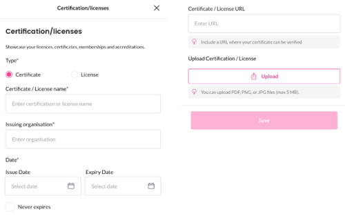 You may also add any relevant certificates or licences. This section is optional but can help strengthen your profile for certain roles.